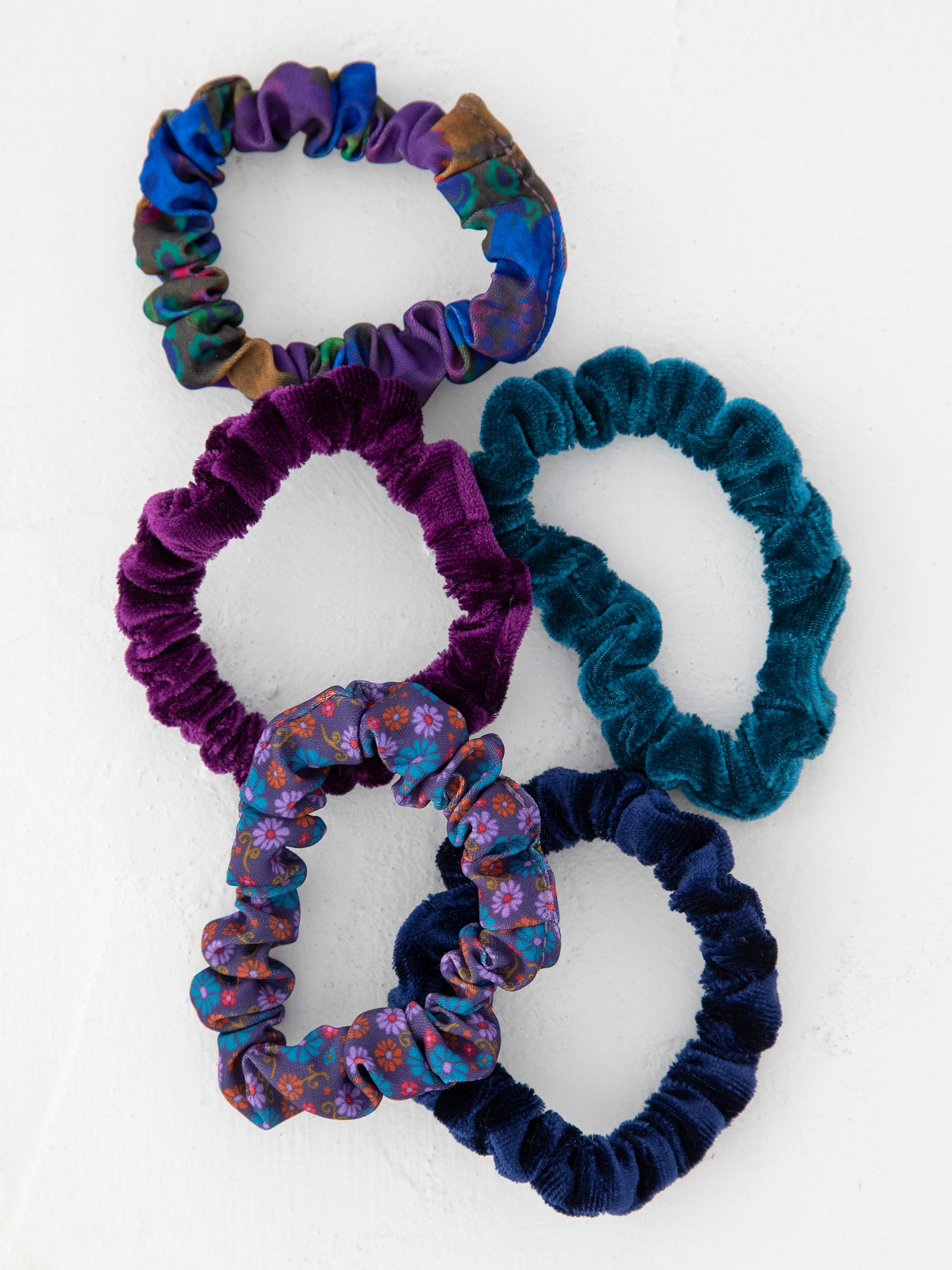 Print and Velvet Scrunchies, Set of 5 - Navy