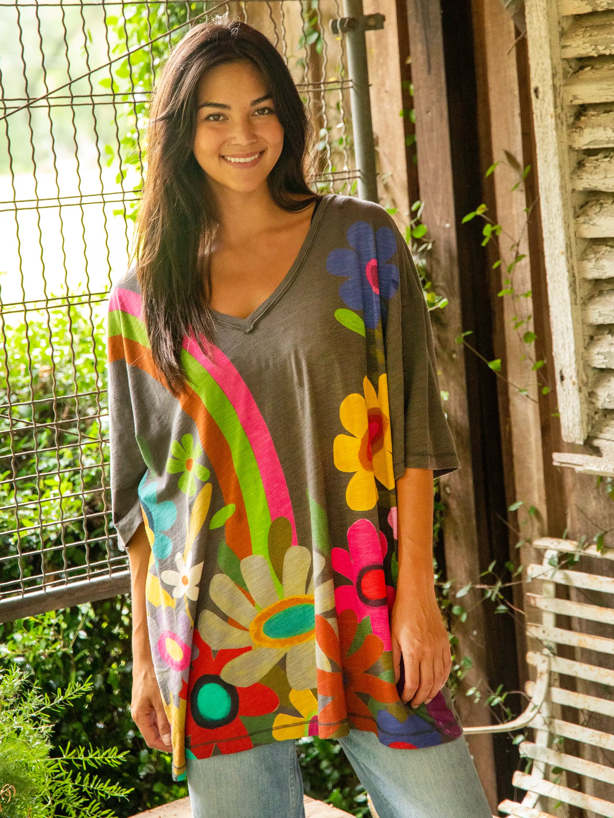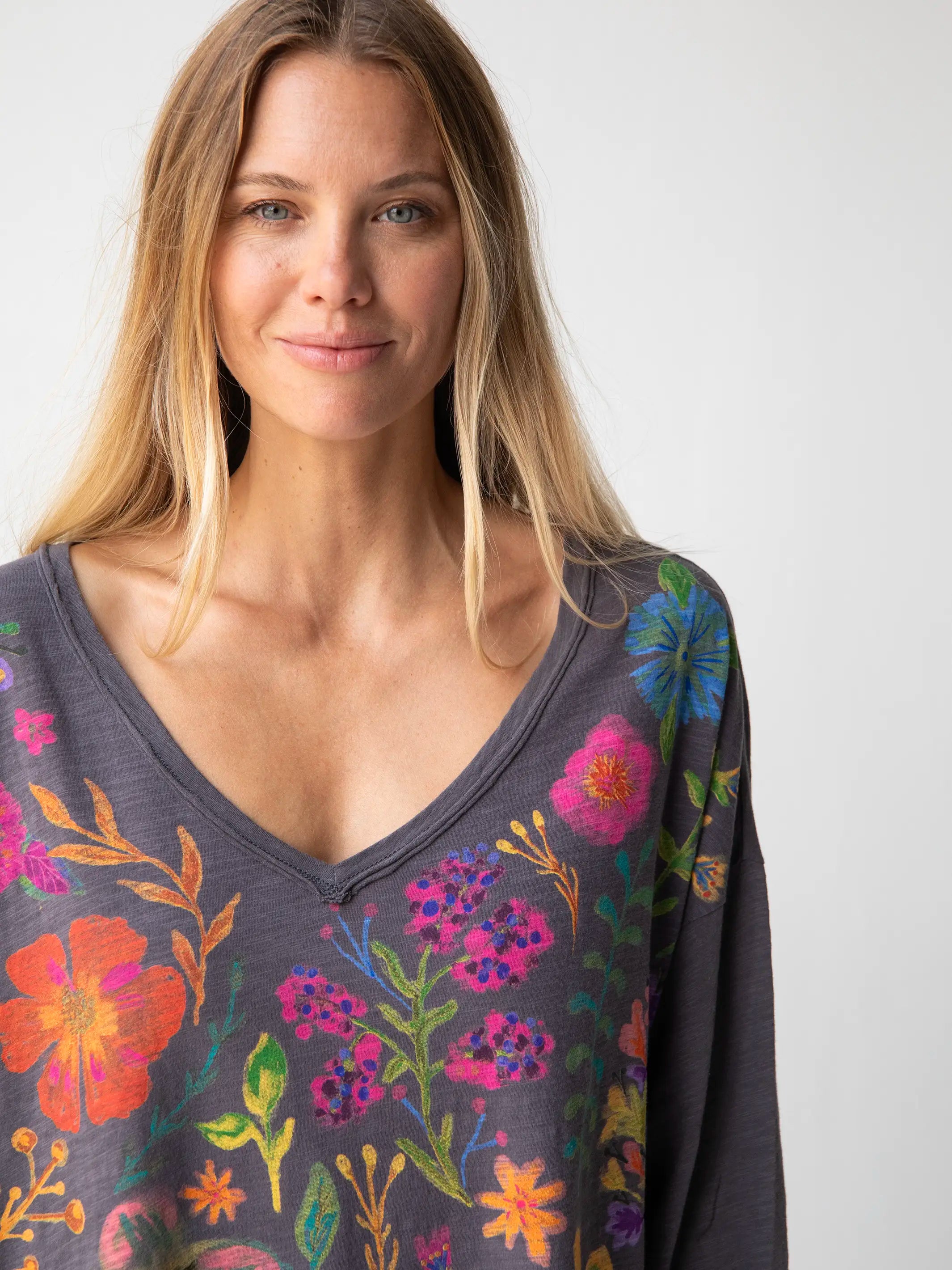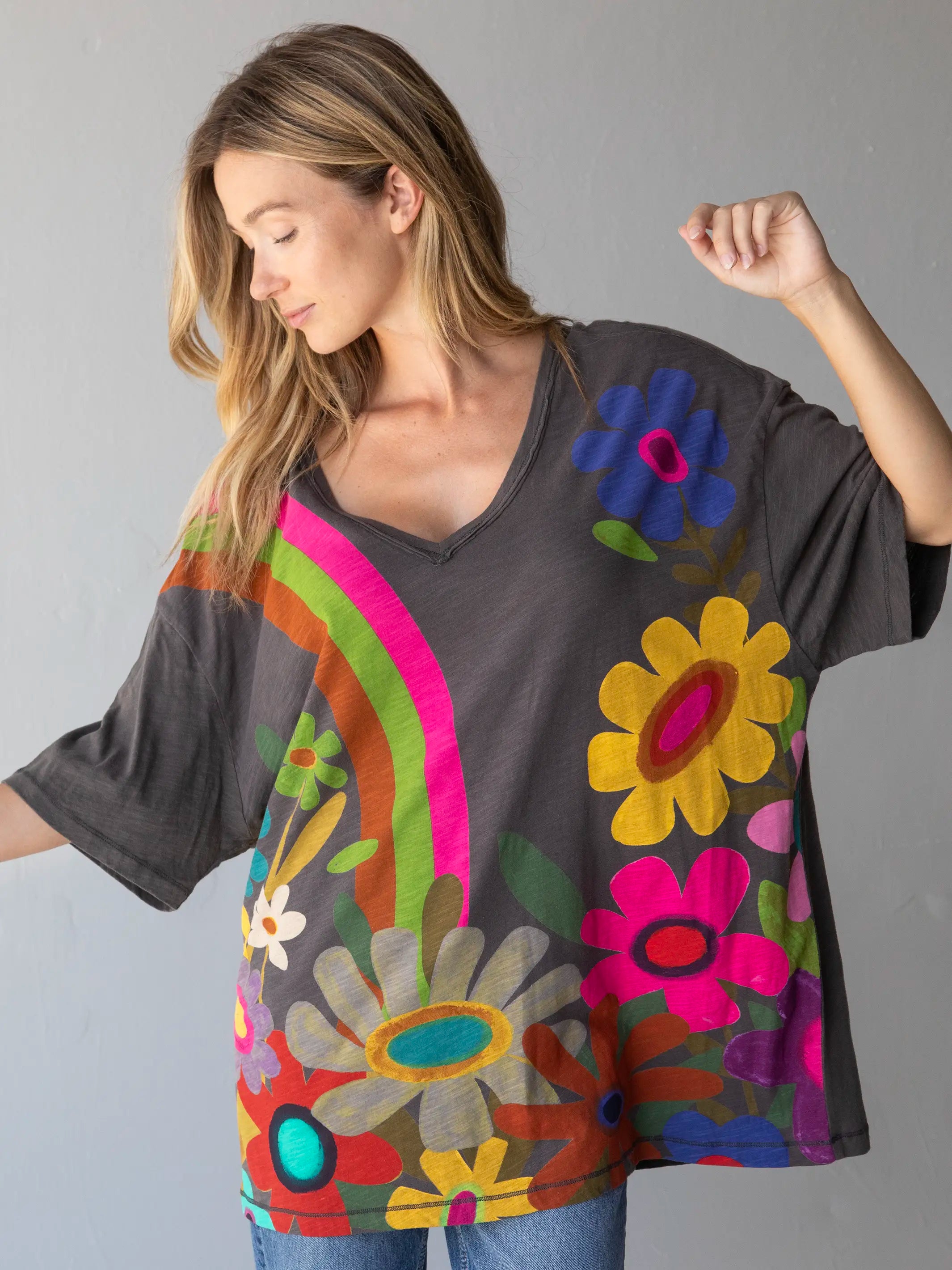 One Size Cotton Easy V-Neck Tee - Charcoal Flowers
