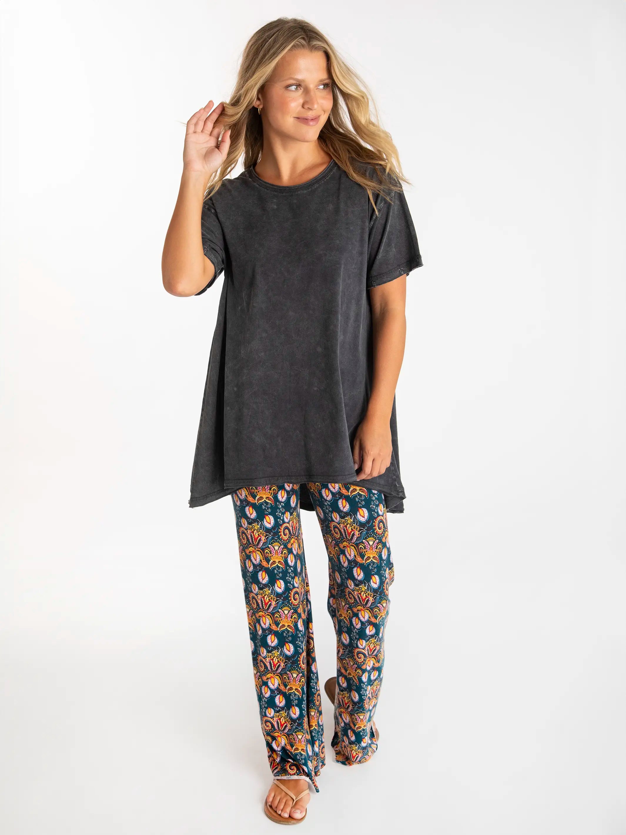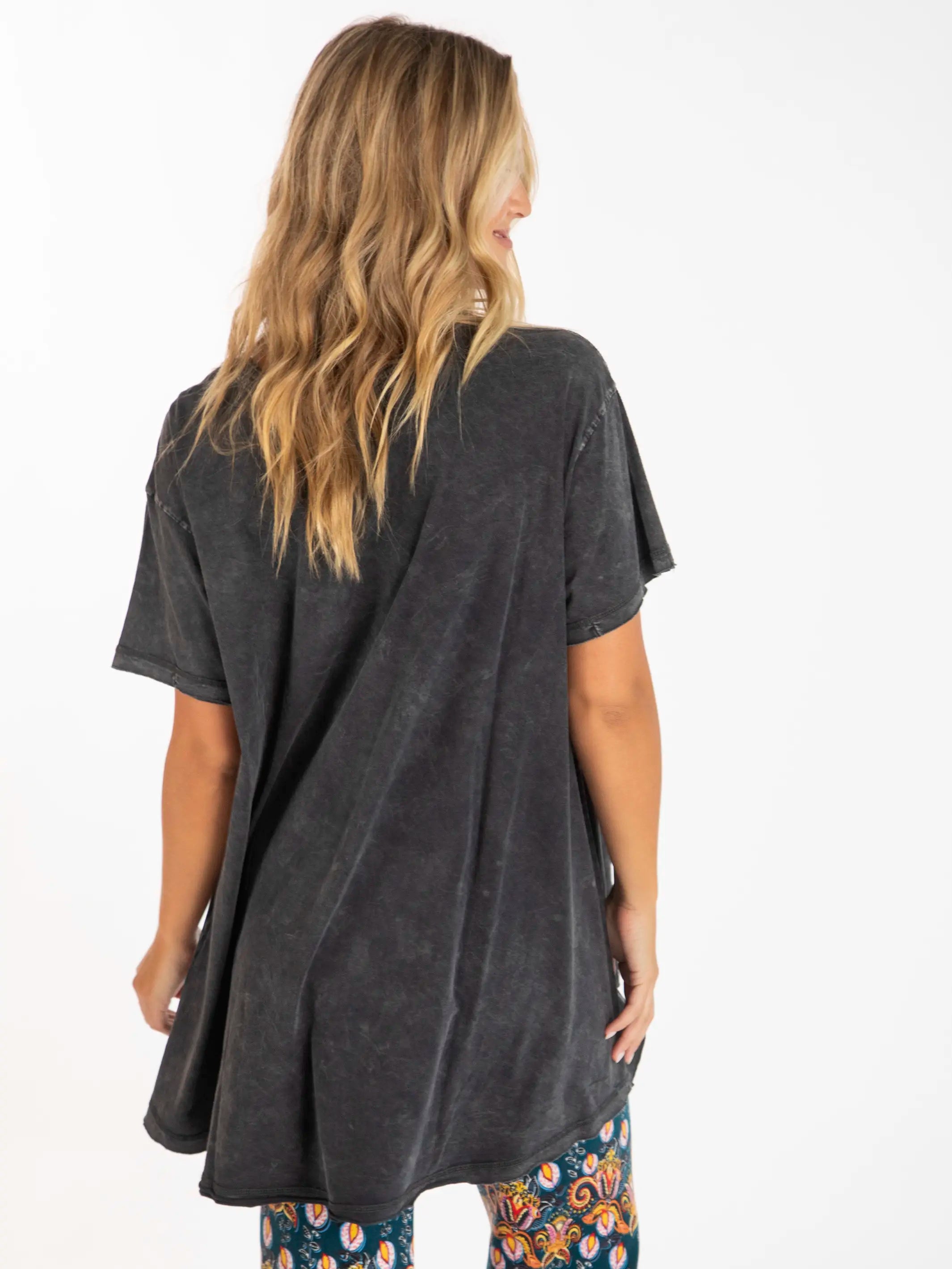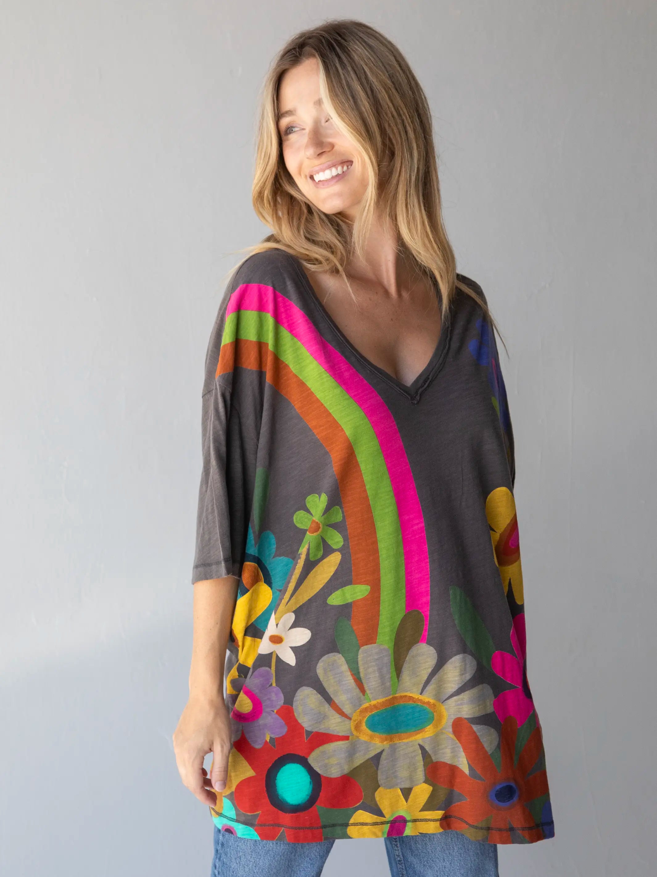 One Size Cotton Easy V-Neck Tee - Charcoal Flowers