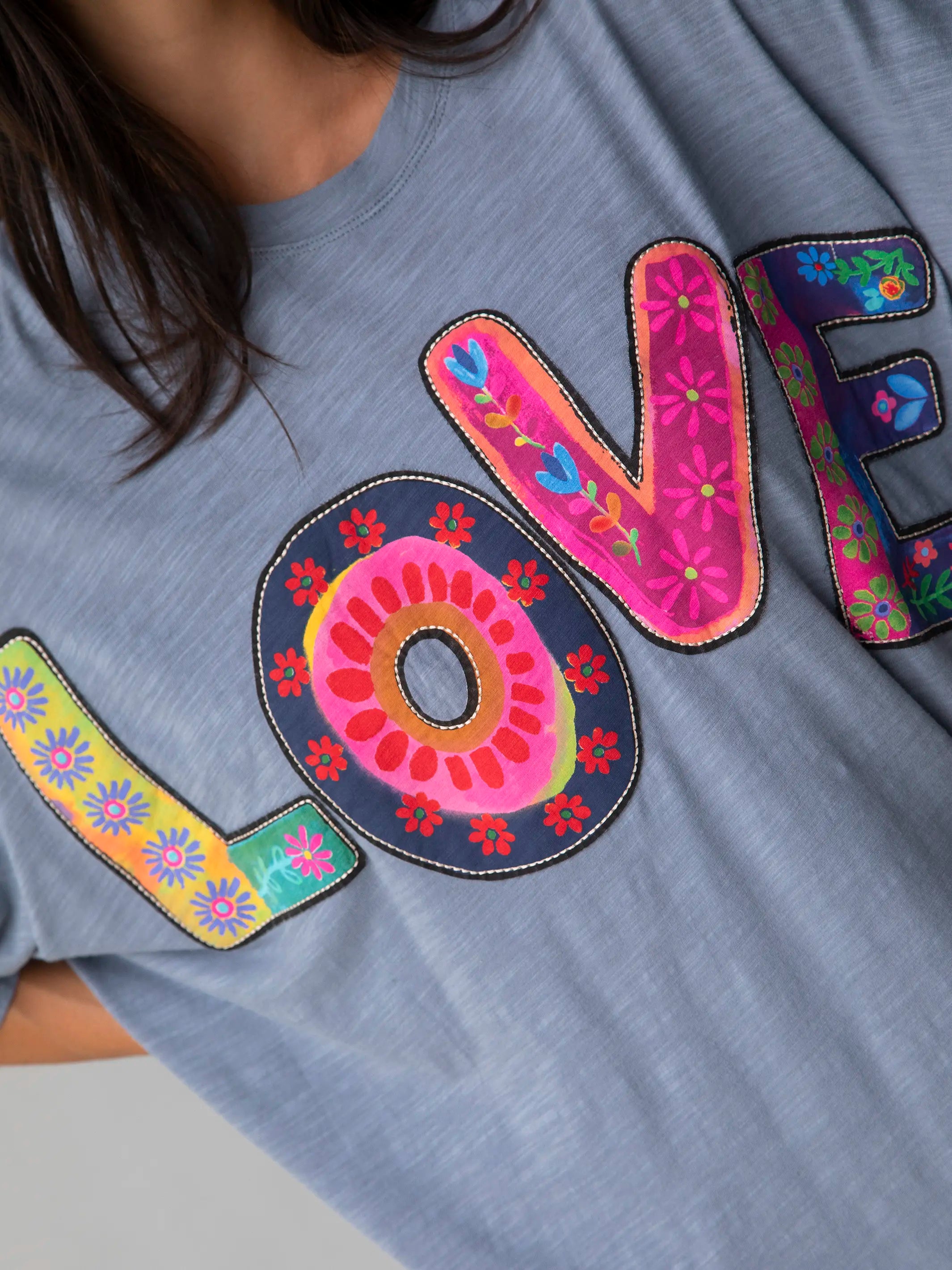 Oversized Cotton Applique Tee - Dusty Blue Love