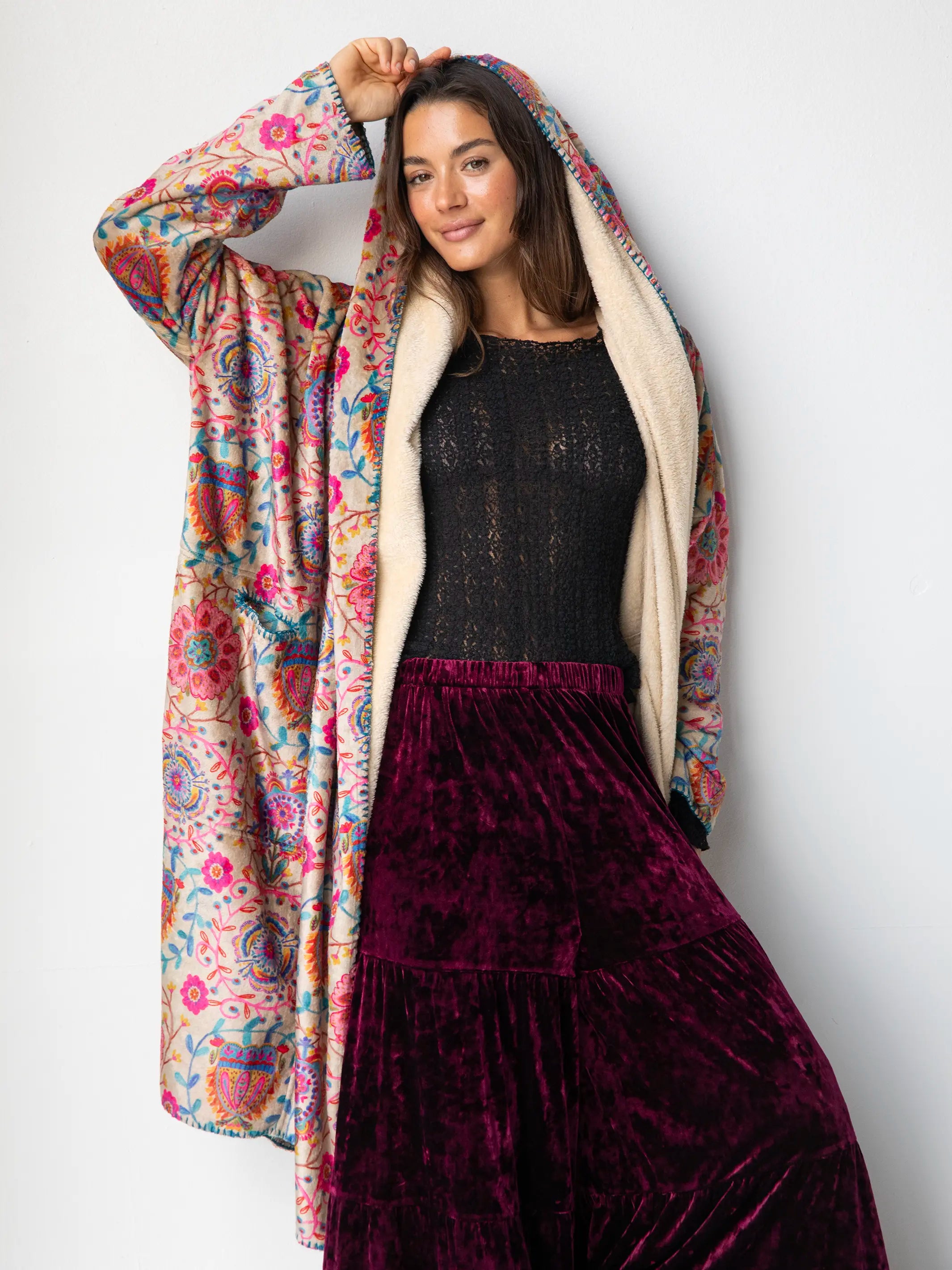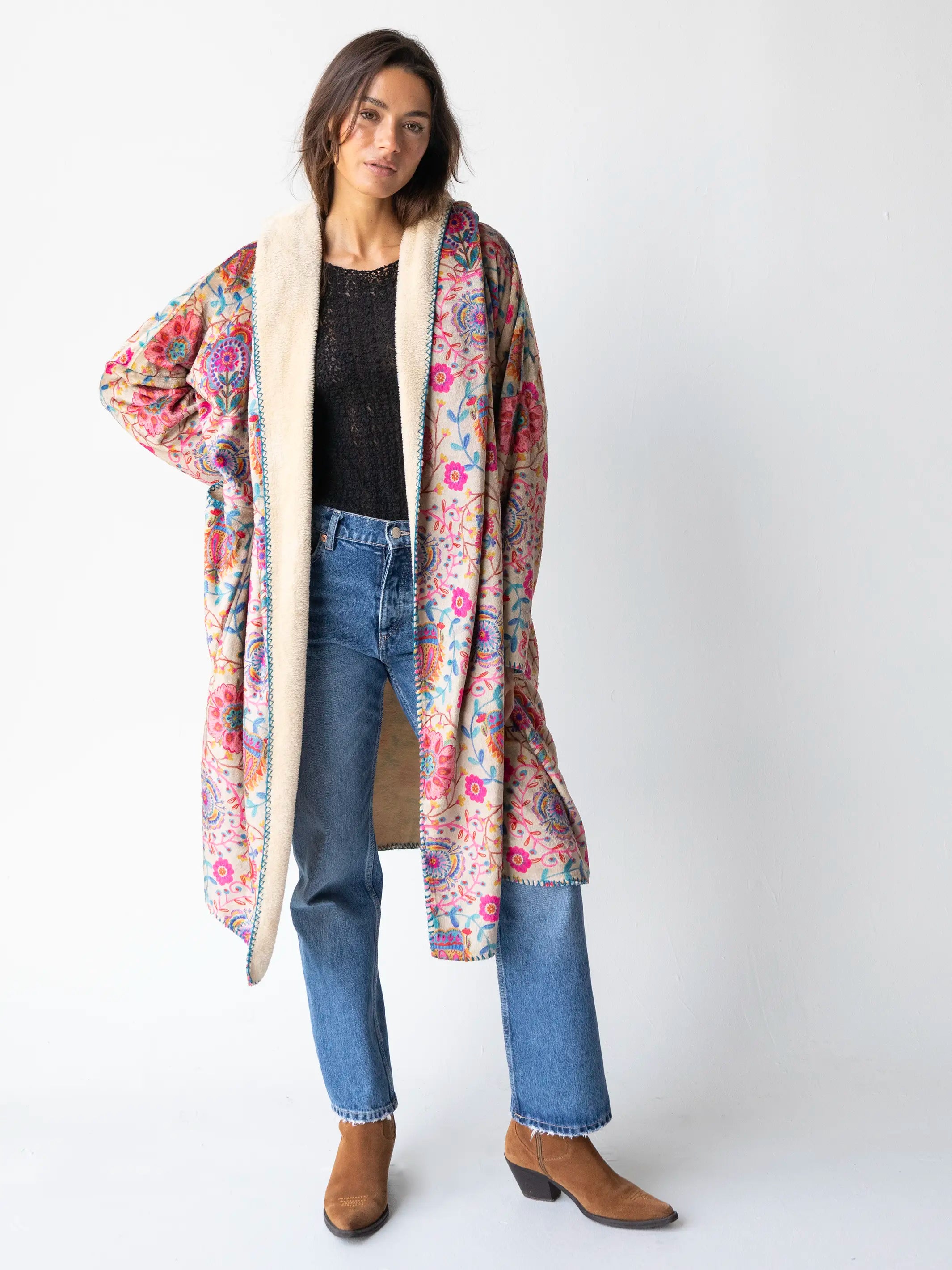 Long Cozy Blanket Kimono - Cream Printed Folk Circles