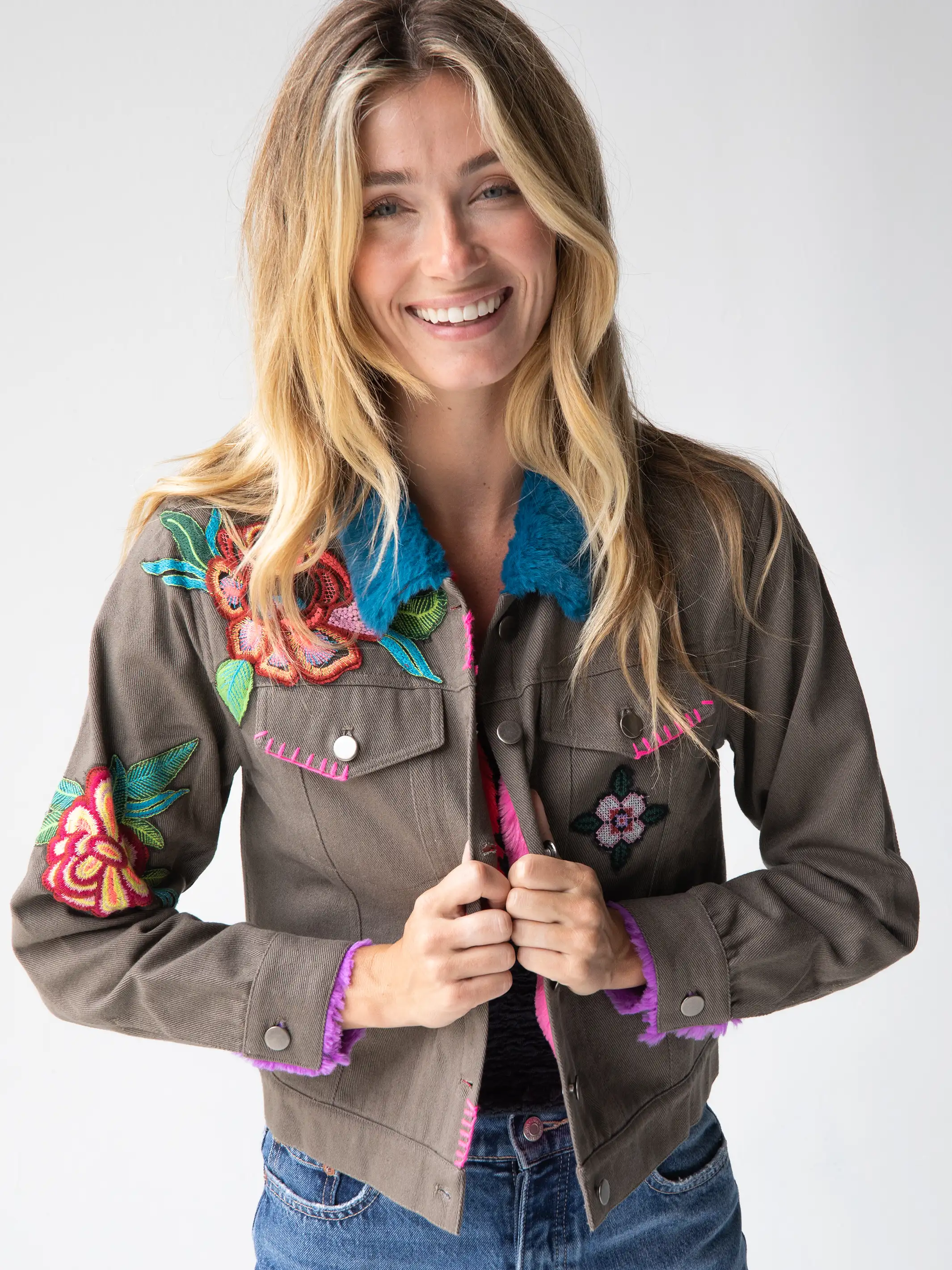 Aida Embroidered Thermal - Charcoal Folk Flowers