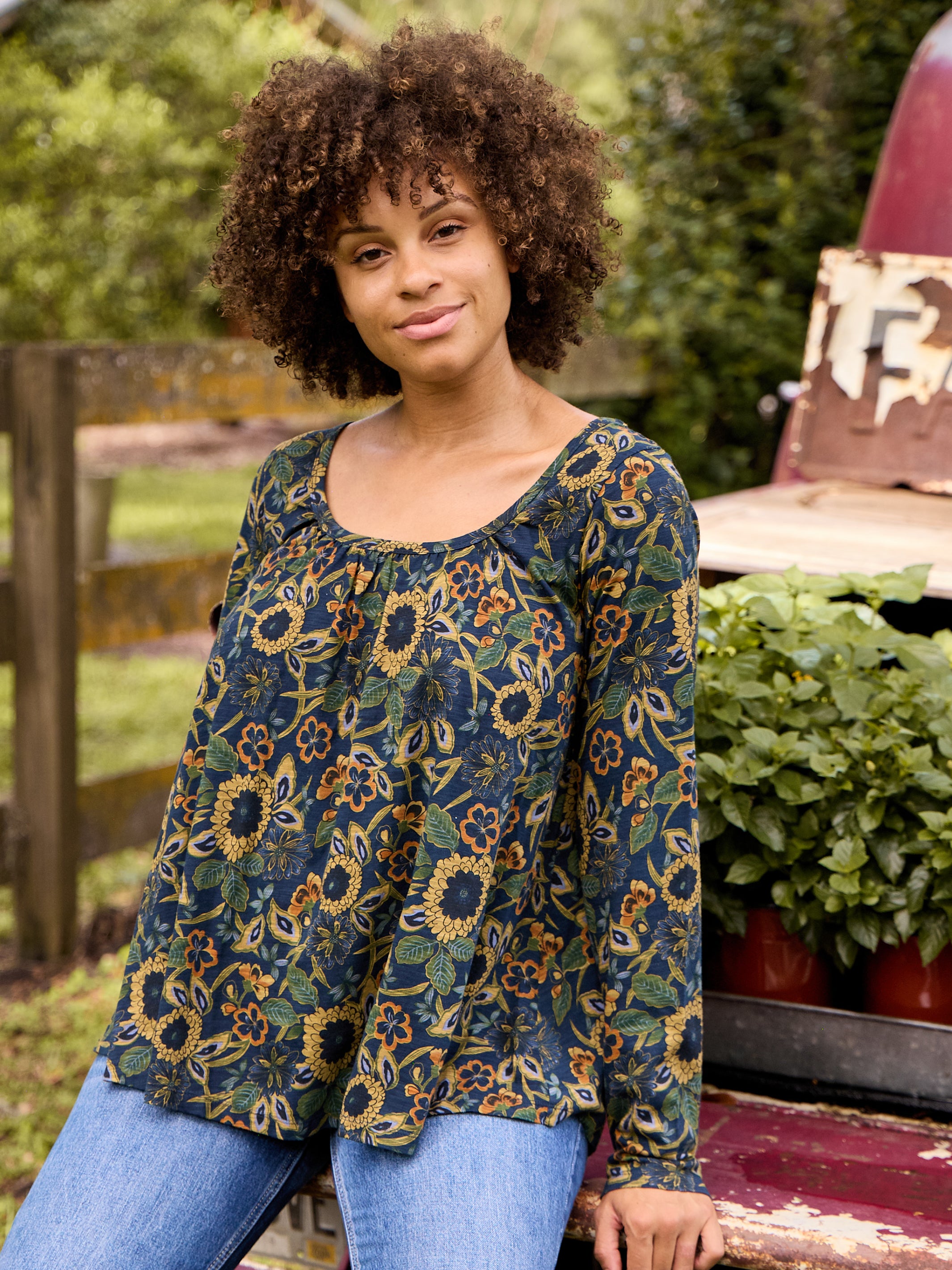Long Sleeve Iris Top - Navy Tan Dahlias