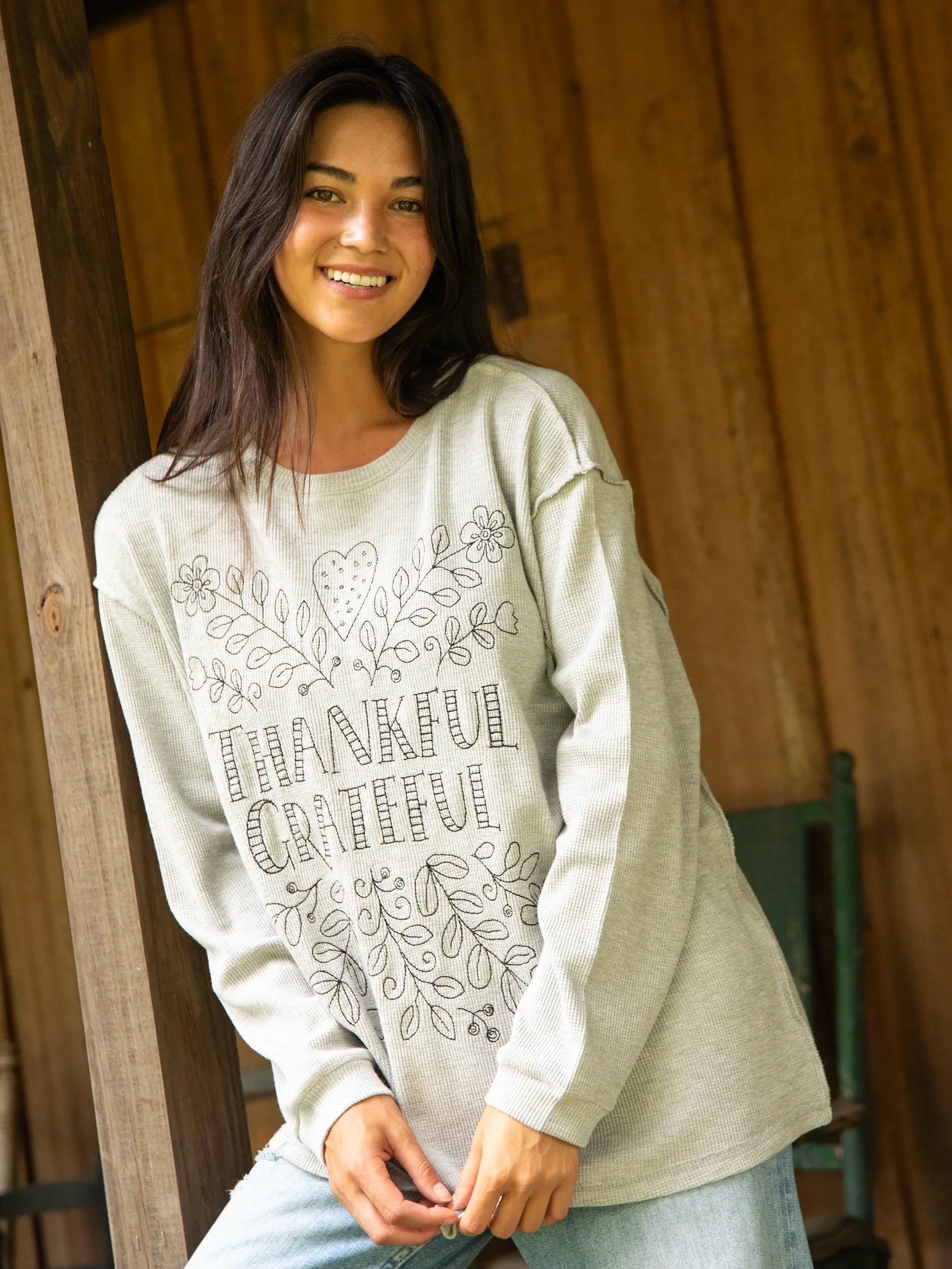 Aida Embroidered Thermal - Heather Grey Thankful & Grateful