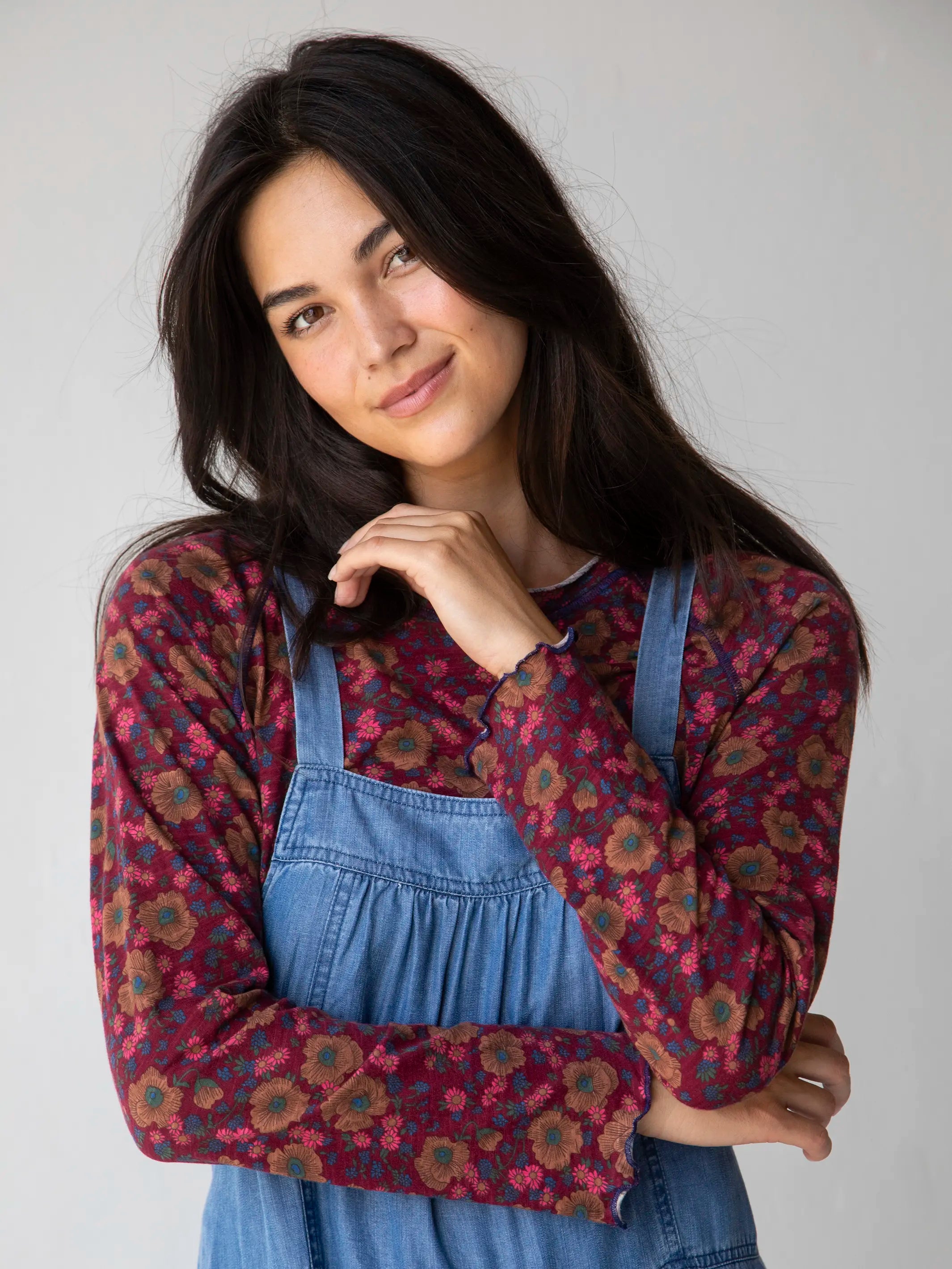 Lily Cotton Long Sleeve Tee Shirt - Cranberry Brown Floral