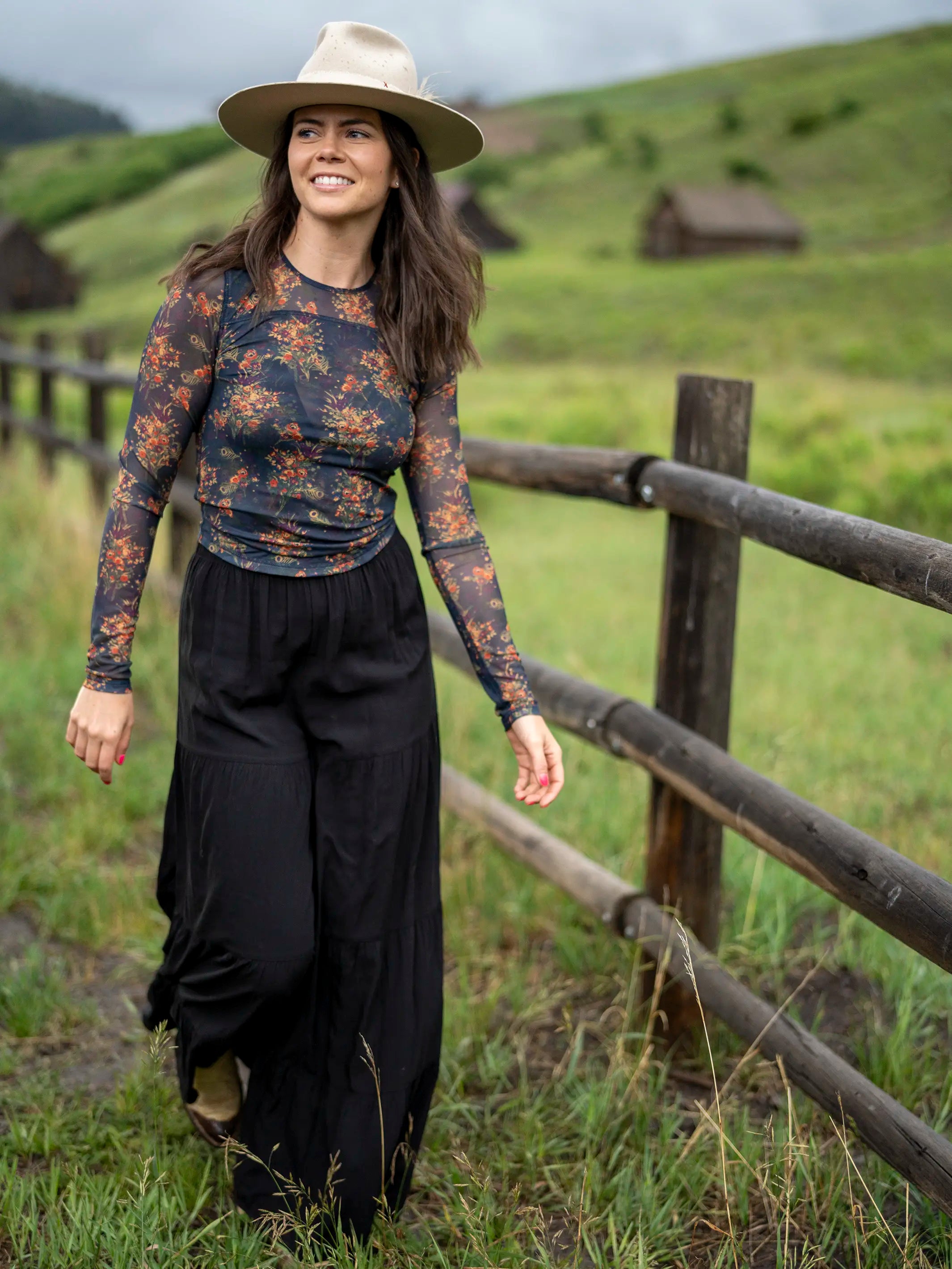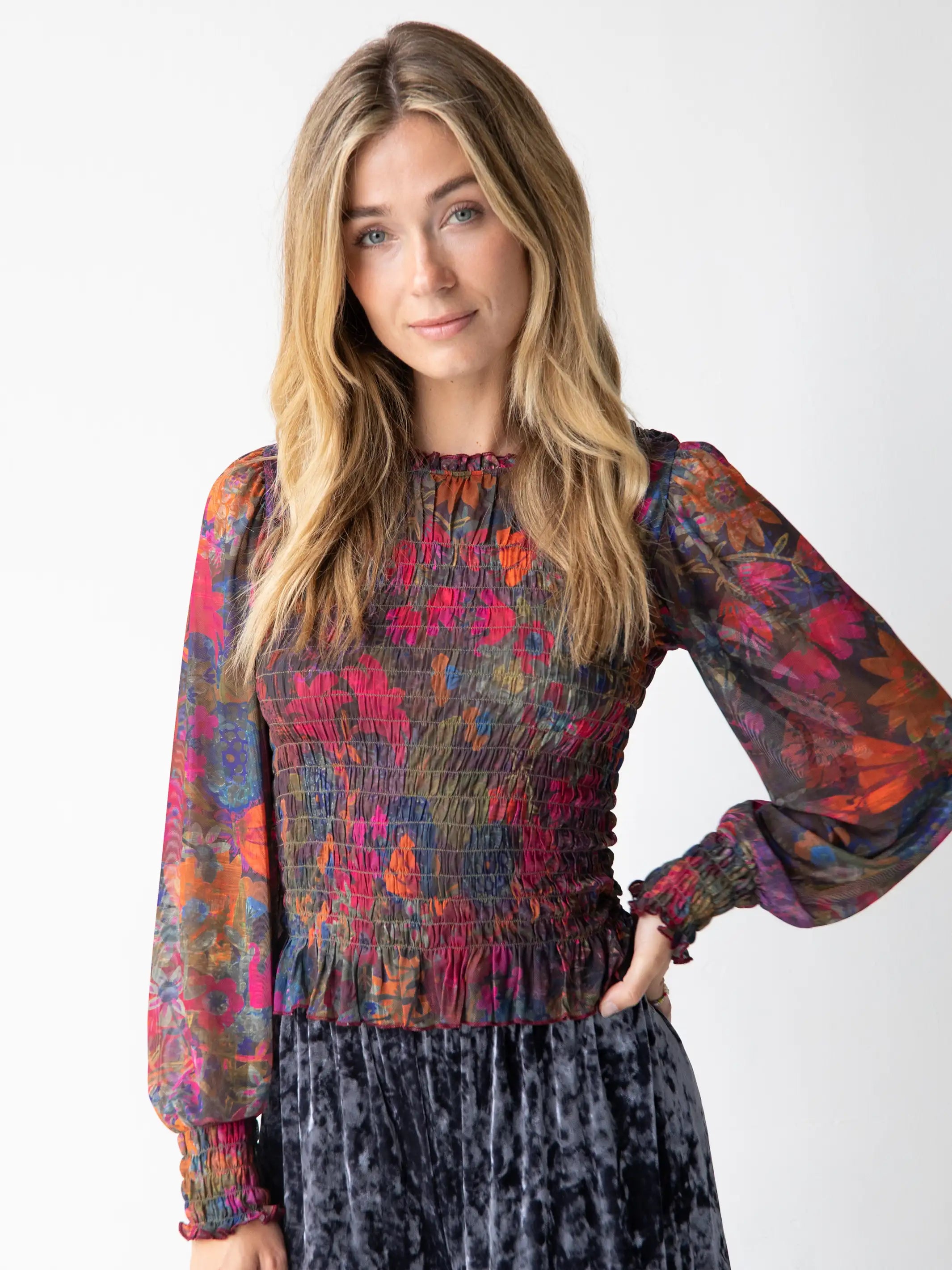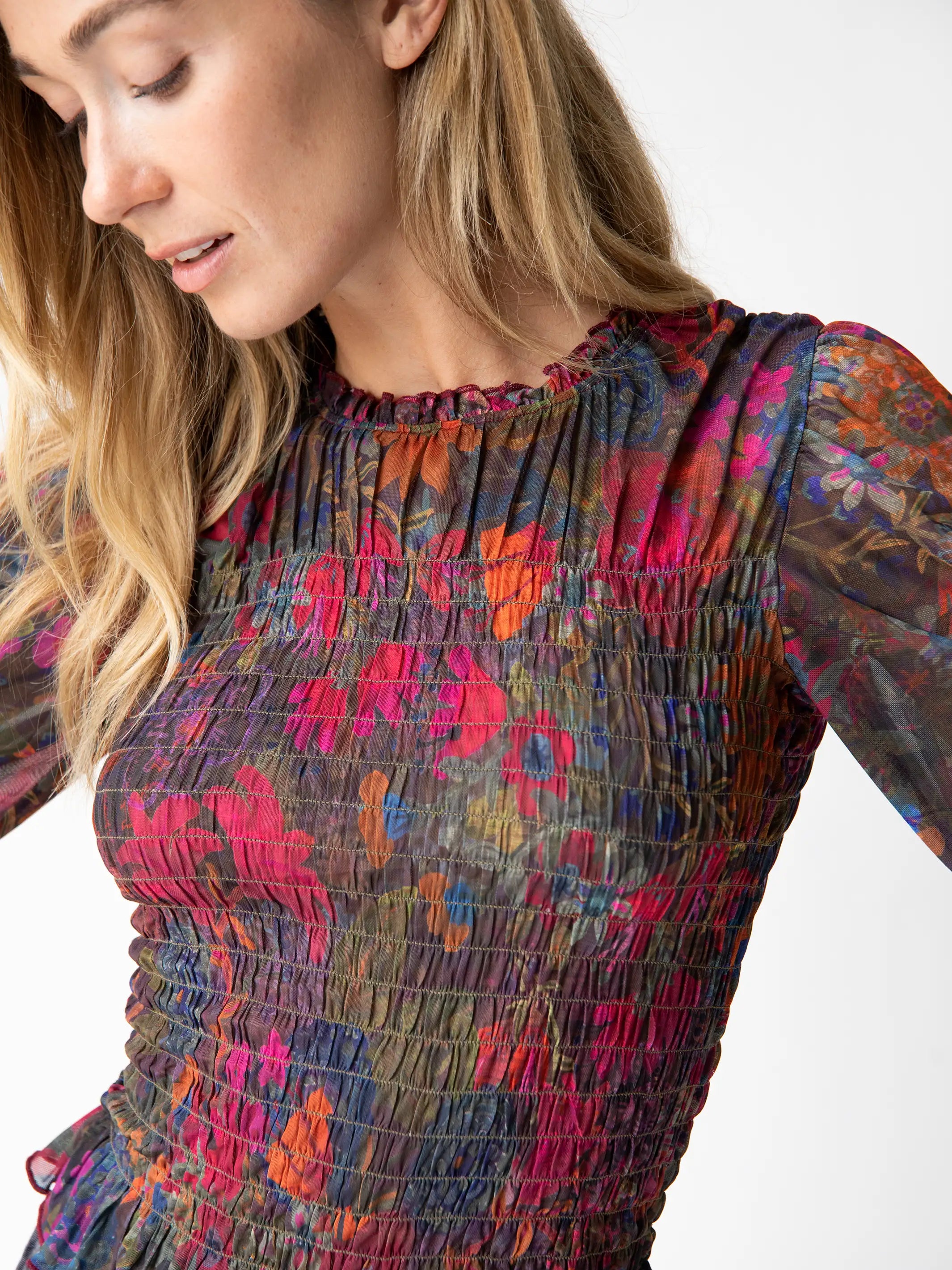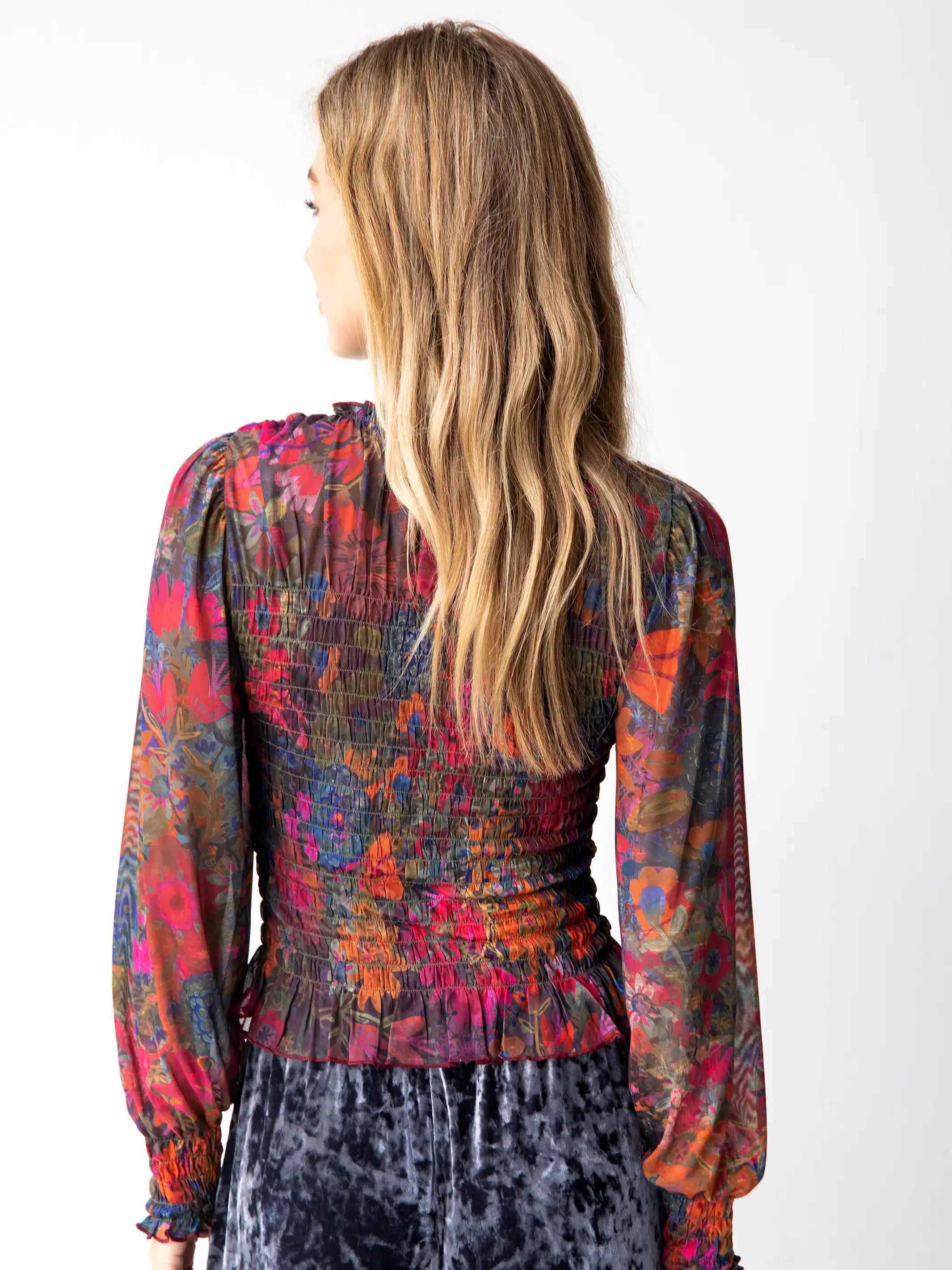 Juliana Mesh Smocked Top - Dark Floral Garden