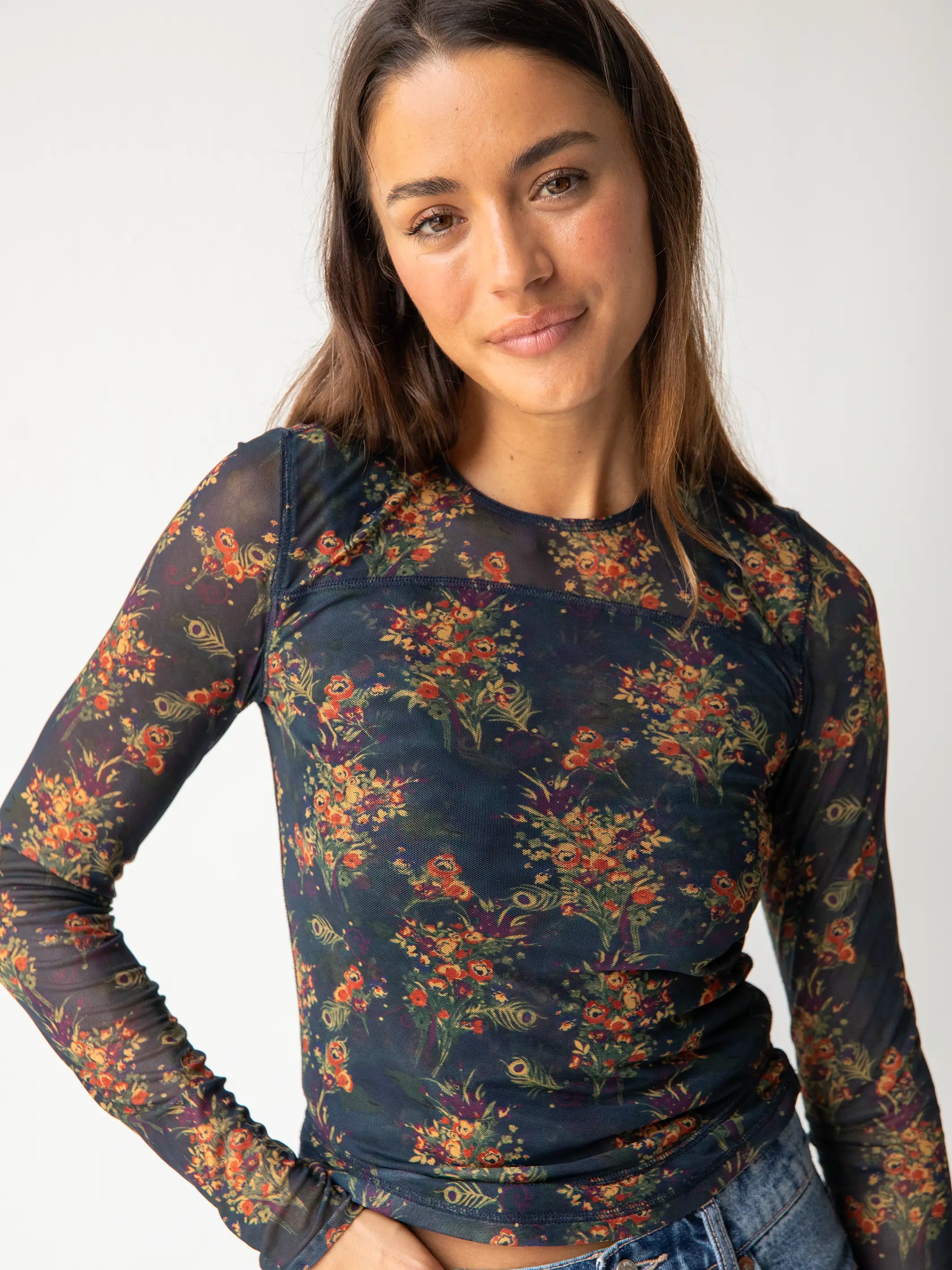 Sloane Mesh Long Sleeve Top - Navy Red Feathers